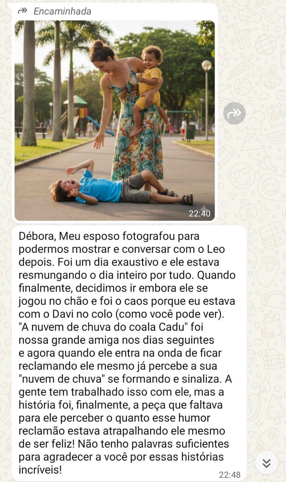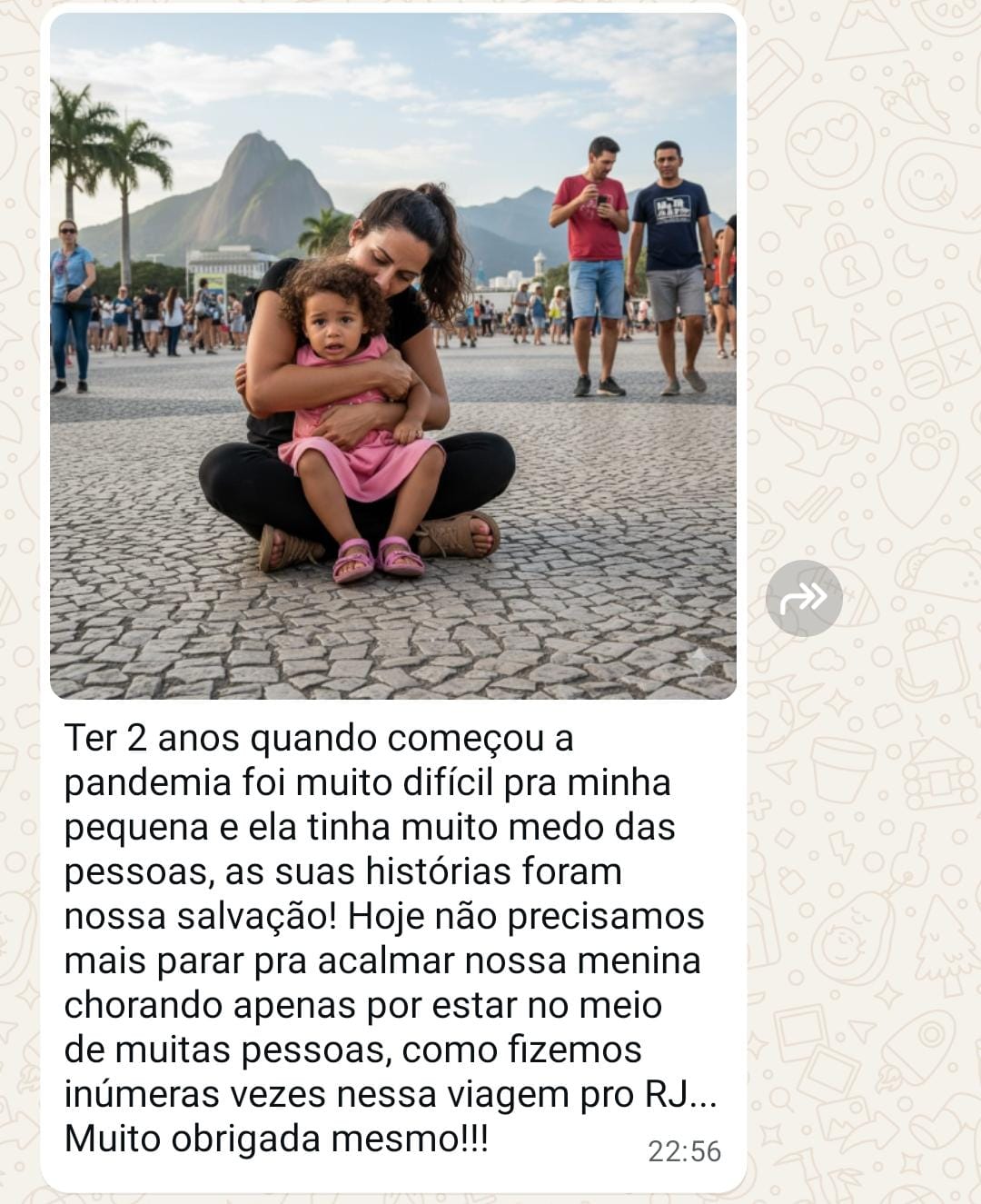 "Comecei a usar com meu filho de 4 anos. Em vez de brigar, conto a história do Leãozinho Bravo... Ele mesmo já pede! Mudou a nossa rotina!"